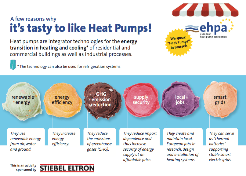 These benefits are colour-coded in each ice cream flavor and participants are invited to use these titles when ordering an ice cream. Heat pumps are not only used to produce heating, they are also used for refrigeration systems, cooling residential applications and even Ice Hotels (Kiruna, Sweden). Despite the numerous advantages of our technology, the level of awareness of the general public remains far too low. So reaching out to more than 300 participants in Brussels sounds like a good – and cool – step in the right direction. Thank you EUSEW for a great week! We are looking forward to next year’s events.