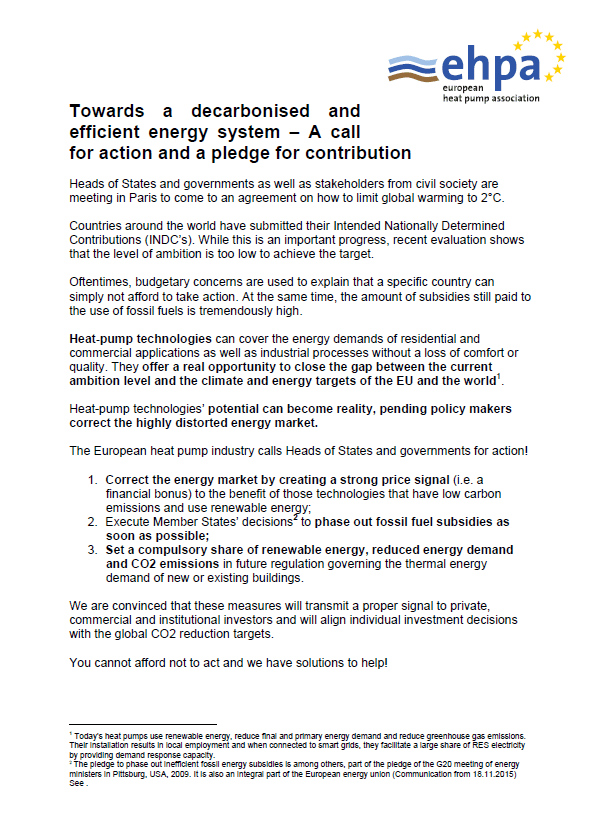 The conference goal to limit the global temperature increase to a maximum of 2 degrees Celsius above pre-industrial levels by reducing greenhouse gas emissions can be achieved only by switching to renewable energy. Together with the national heat pump associations, EHPA issued a call for action to all the stakeholders to integrate the heat pump technologies to their plans of fulfilling the Paris Agreement obligations.